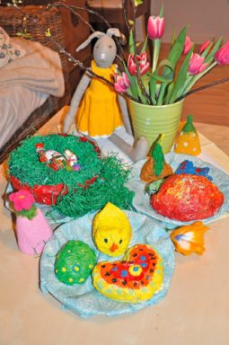 Für die Ostertierchen, Eier und Schalen sollte viel Zeit eingeplant werden, da das Pappmaché und die Farben mehrere Tage zum Trocknen brauchen.