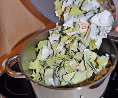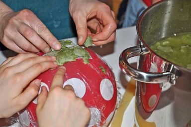 Zu den breiigen Kartonfetzen Tapetenleim dazugeben. Nun ist Fantasie gefragt. Wird aus dem Teigklumpen ein Ei oder ein Kücken? Ein Herz oder eine Tulpe? Jetzt wird geknetet und geformt. Es können auch Eierkartons umwickelt werden. Überschüssiges Wasser vorsichtig ausdrücken. Wird die Masse bröselig, einfach wieder etwas Wasser dazugeben. Wer möchte, kann zu guter Letzt einige Lagen Zeitungspapier oder Küchenrolle auflegen, um die Bilder, Buchstaben und dunklere Eierkartons zu verdecken. Gut durchtrocknen lassen. Wer eine Schale kreieren möchte, nimmt sich einen Ball oder eine umgedrehte Schüssel und bedeckt sie mit Frischhaltefolie. Nun wird das Pappmaché Lage für Lage aufgetragen. Ist die Masse getrocknet, werden Unebenheiten am Rand gerade (oder wellenförmig) abgeschnitten.