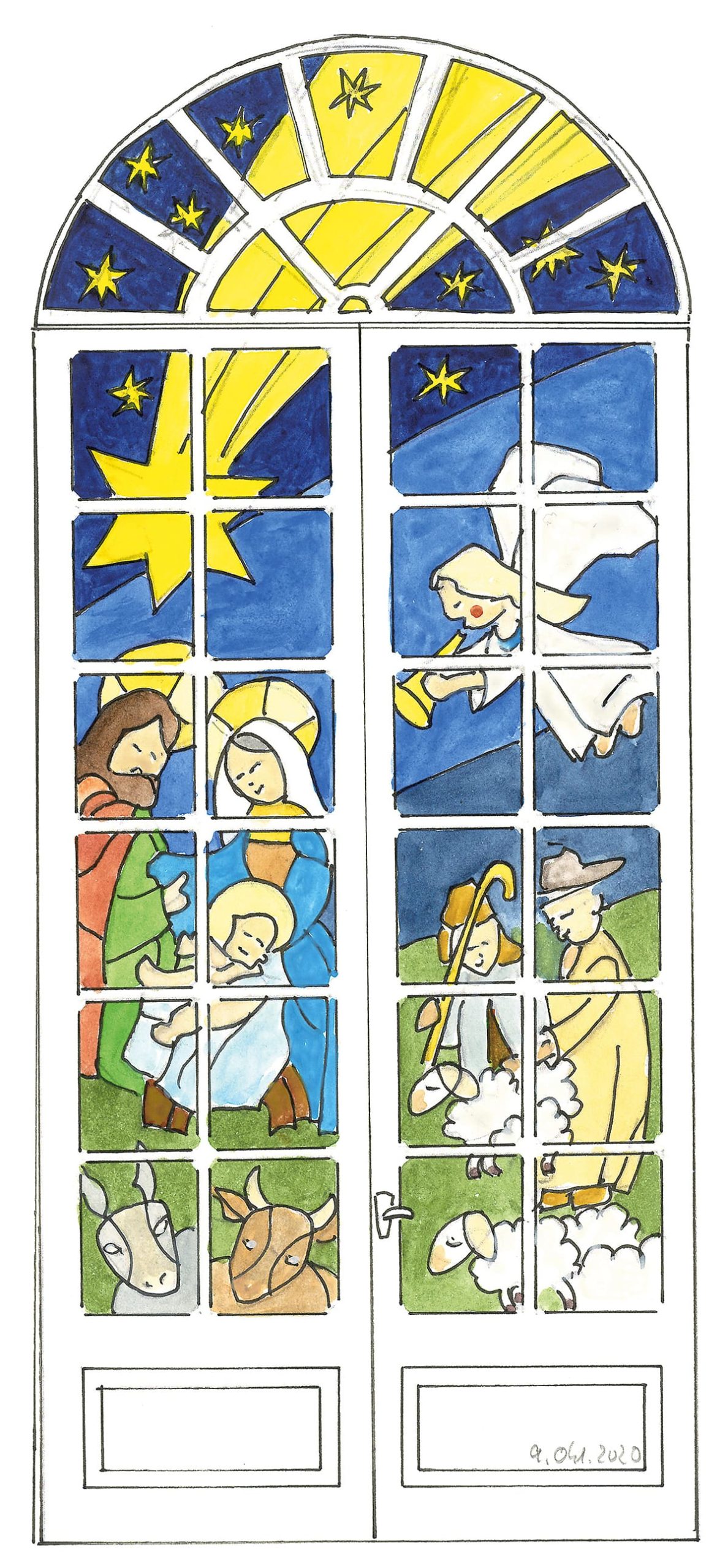 Ende des Sommers bewegte Gemeindepädagogin Caroline Walter die Frage: Wie kann man in diesen unsteten Zeiten die Botschaft von Weihnachten in der Welt sichtbar machen? Ein Blick auf die Kirchentür ließ sie schmunzeln: „Tatsächlich hat die Kirchentür neben einem Rundbogen 24 gleiche Rechtecke. Das war für mich ein Wink des Himmels, dass es einen Versuch Wert sei, die Idee eines Kirchentür-Adventskalenders mit anderen zu teilen und die Initiative zu ergreifen.“ Für die Umsetzung der Idee konnte Caroline Walter den ortsansässigen freischaffenden Künstler Egon Arnold gewinnen, der sich seit dem ersten Gespräch im September intensiv mit dem Motiv, der Gestaltung und den technischen Voraussetzungen beschäftigt und dabei Unterstützung von seiner Frau Susana Schmidt erfahren hat. So wurden die Konturen der Figuren und Bildteile auf das großformatige transparente Trägerpapier übertragen. Das Vorhaben lebt von Partizipation: Die Reiß- und Klebetechnik mit Transparentpapier ermöglicht, dass sich Groß und Klein an der farblichen Gestaltung eines jeden Fensters beteiligen und damit individuelle kreative Akzente setzen können. So besteht die Einladung, dieser Aufgabe gemeinsam nachzukommen.