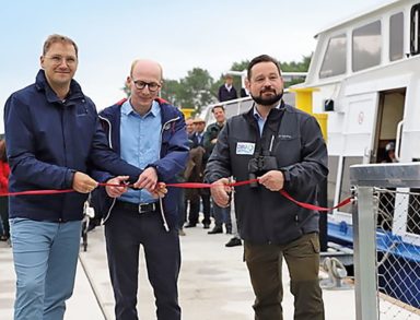 - Patrick Dahleman (l.), Parlamentarischer Staatssekretär für Vorpommern des Landes Mecklenburg-Vorpommern, schnitt gemeinsam mit DBU-Generalsekretär Alexander Bonde (r.) und Andreas Neumann von der Fahrgastreederei Apollo das Band zur Einweihung des Hafens auf dem Ruden durch | Foto: Christian Wingrove-Rogers