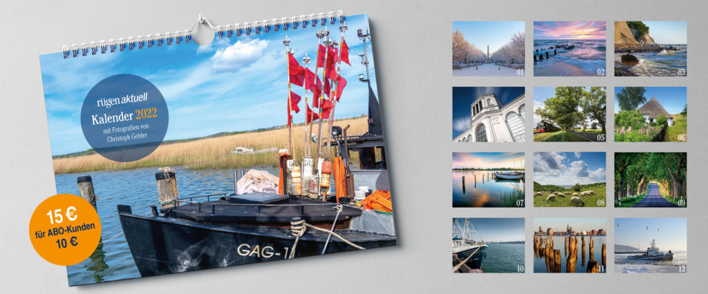Bestellen Sie jetzt den rügen aktuell Jahreskalender 2022 mit Fotografien von Christoph Gebler: telefonisch unter 03 83 01 / 80 6-16, per E-Mail: verlag@ruegen-druck.de oder online unter www.ruegen-druck.de/shop/